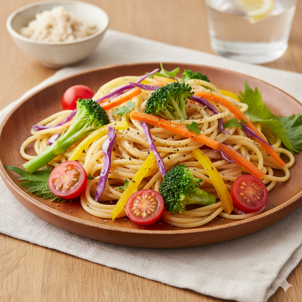 | 実行: | 野菜はパスタと一緒に茹で、塩麹と和える。塩麹の自然な発酵の旨味が、パスタと野菜の風味を柔らかくまとめ上げる。 |