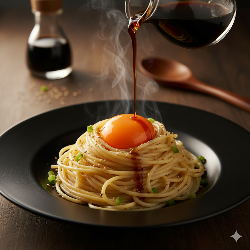 | 実行: | 茹でたパスタに生卵を割り入れ、醤油と和える。熱で卵が固まりすぎないよう、素早く混ぜるのが重要。 |
